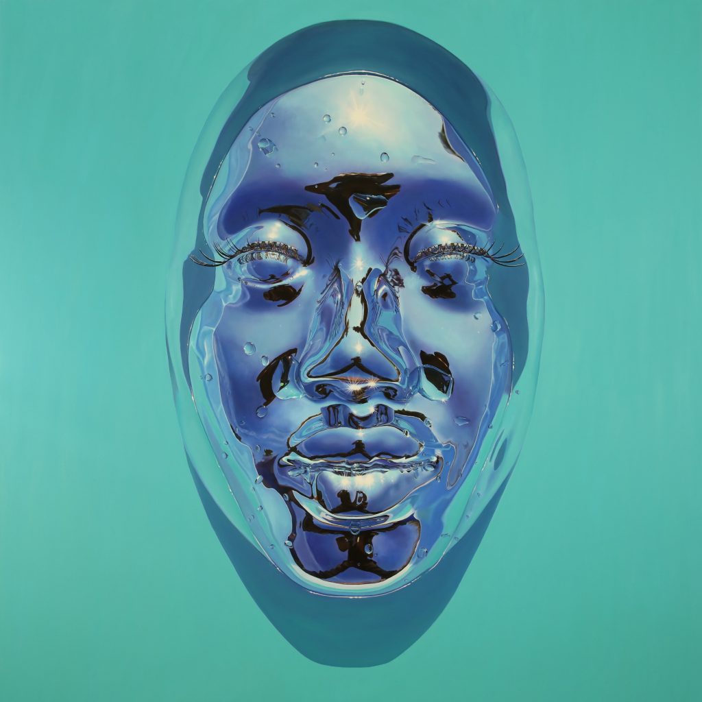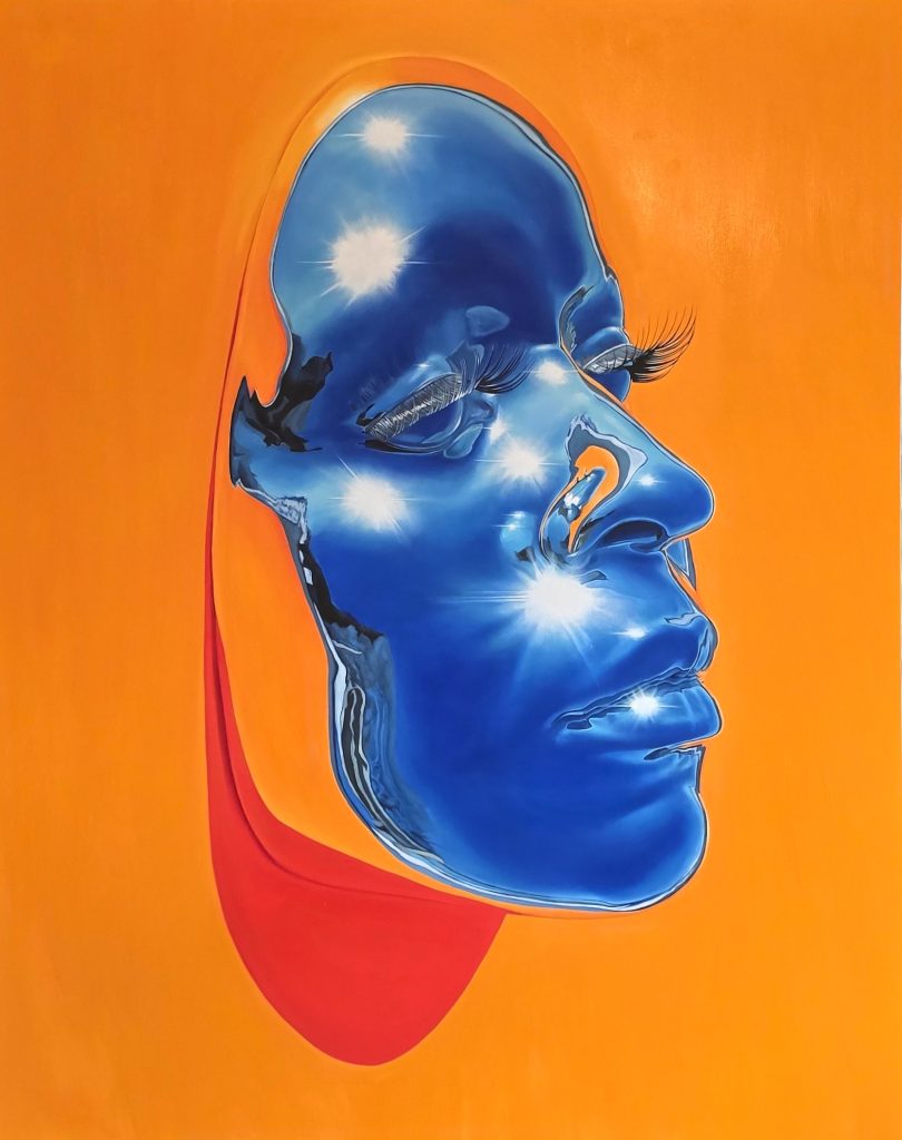 Omolade is best known for his vibrant oil paintings of futuristic, mask-like faces—reflections of identity, divinity, and psychological depth. His signature “Diovadiova Chrome” series explores contemporary ideals of beauty and the masks we wear in society. The series title fuses two Italian words: Dio (God) and diva (goddess), symbolizing a divine femininity. The creative process behind each work is as meticulous as it is symbolic: starting with a facial mold of the model, Omolade creates a resin sculpture finished in chrome and detailed with false eyelashes. This hyper-polished object then becomes the basis for his bold, electrifying portraits—works that gleam like liquid metal.